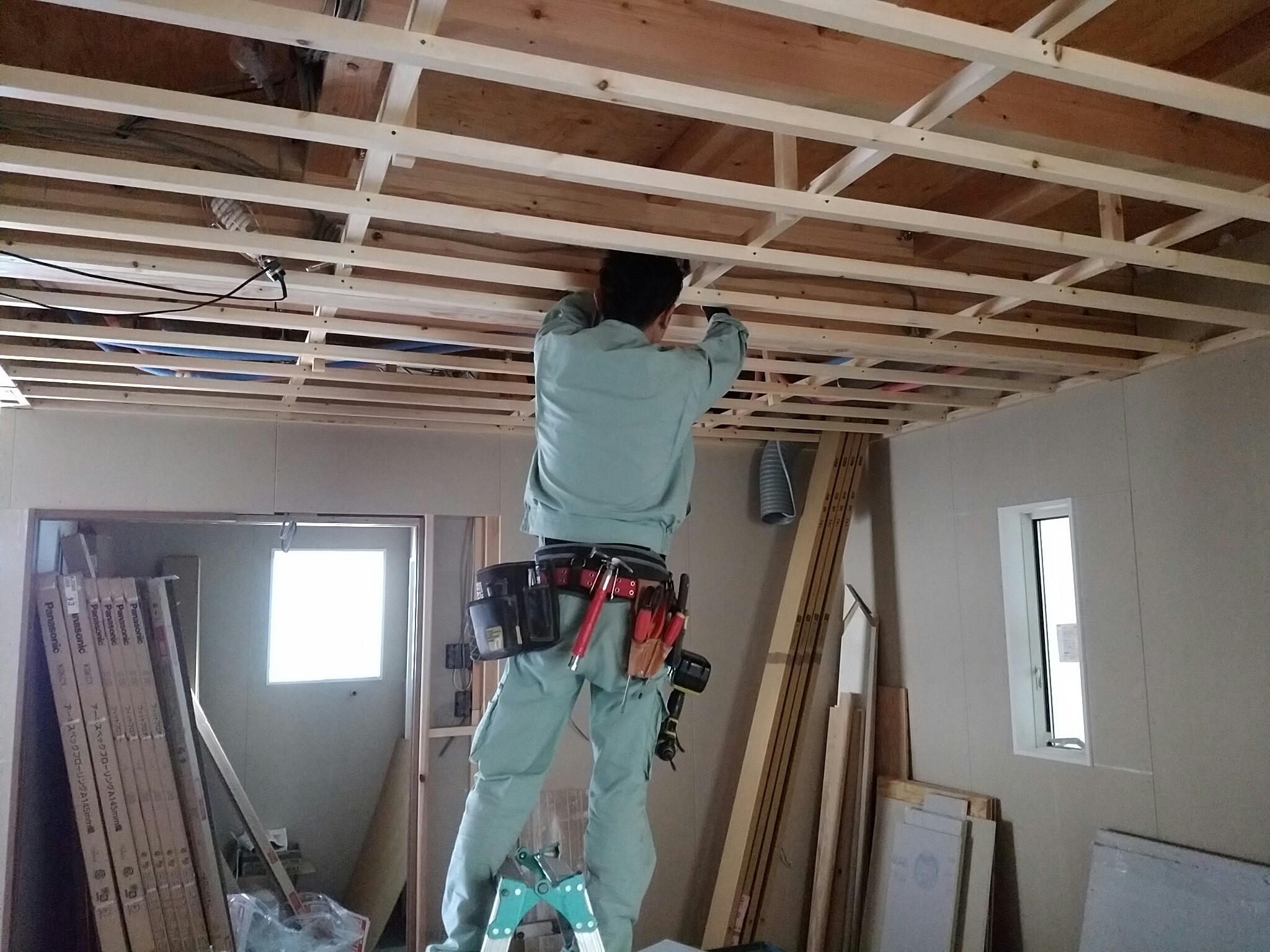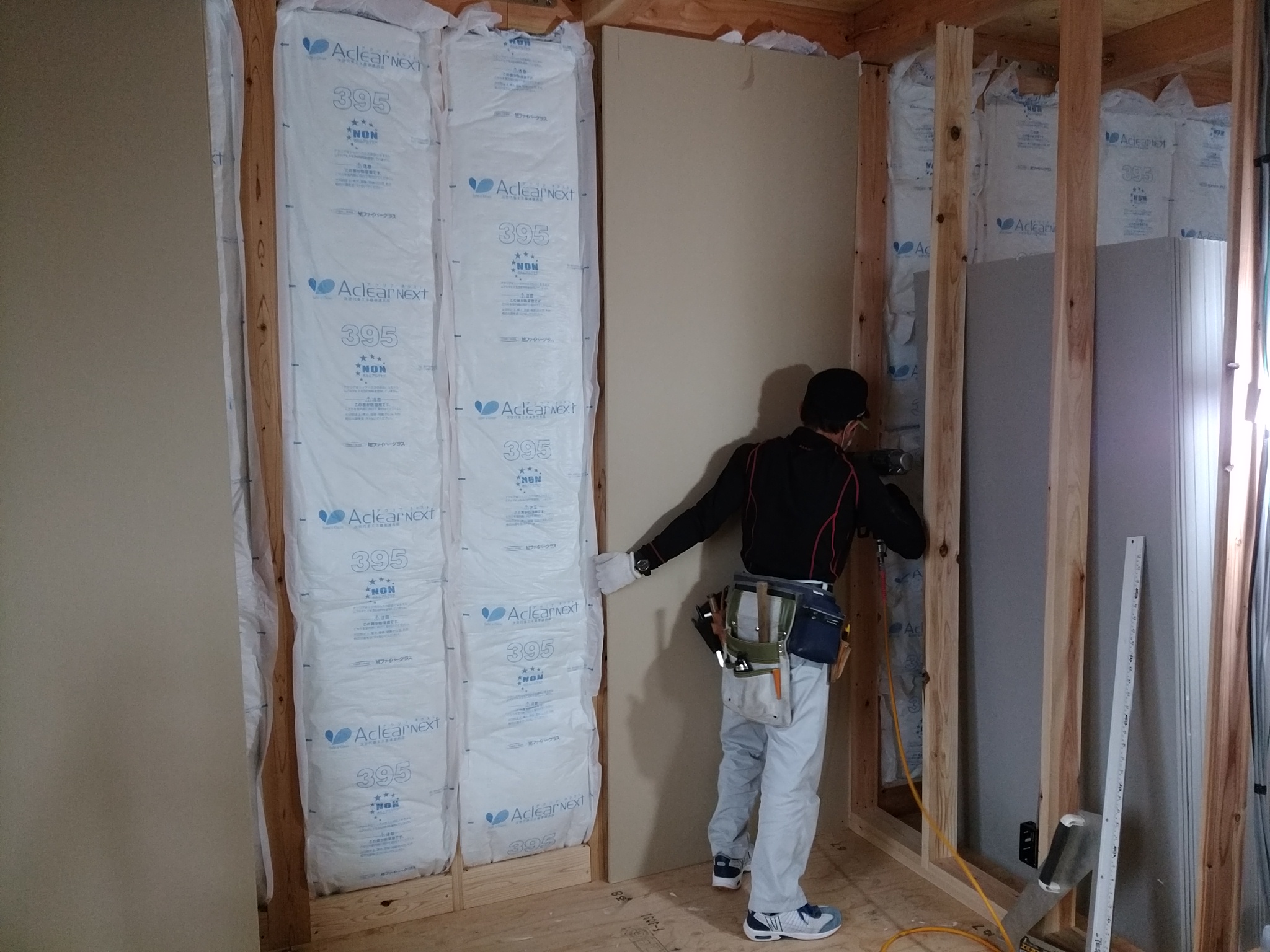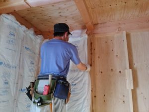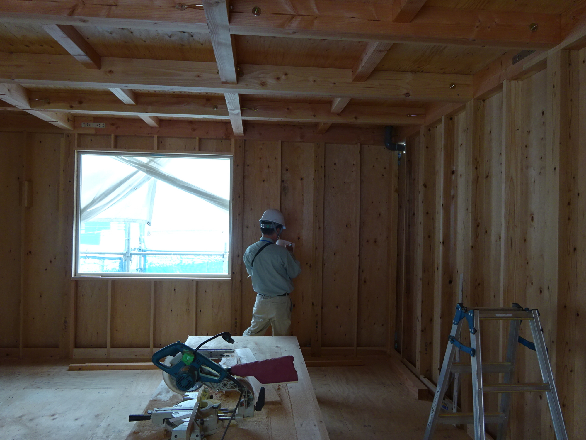 内部は、断熱材の上に合板又はボードを張っていきます。