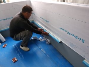 外壁はサイディング張りです。まずは、下地の透湿防水シート張り、水切取付けです。