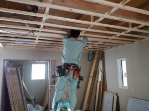 上棟を終えて、次の作業は筋違(すじかい)や金物の取付けです。