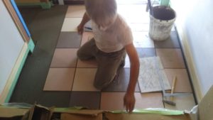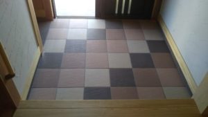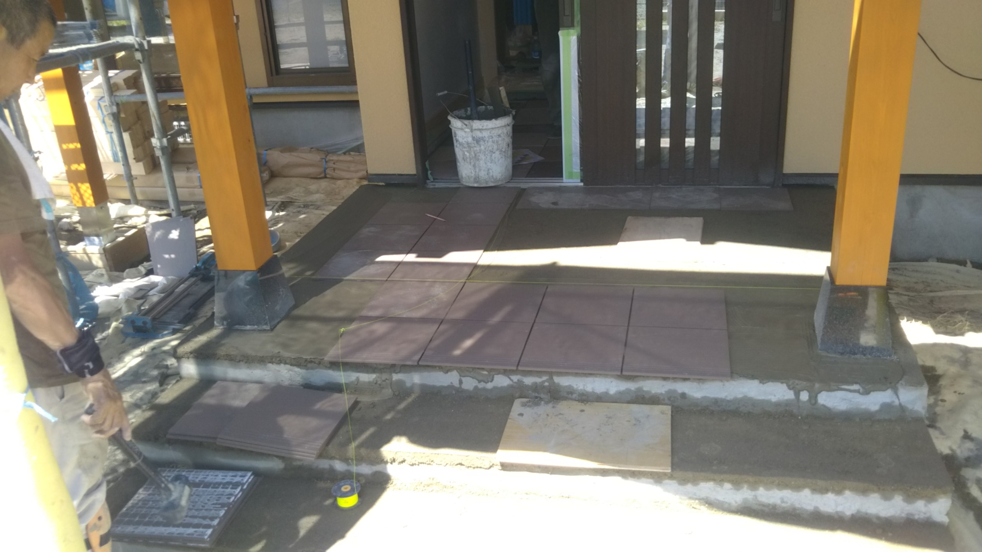 玄関ポーチのタイル張りをしています。