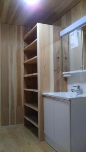 洗面脱衣室には無垢の杉板でダボレール付きの収納棚をつけました。