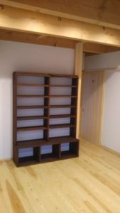リビングダイニングの大工さん手作りの収納棚、お持ちの本棚に色は合わせました。