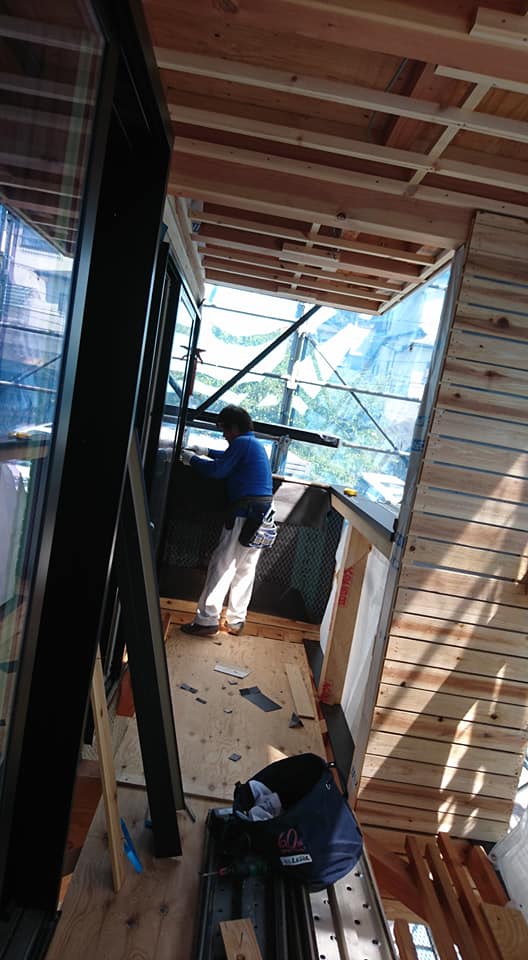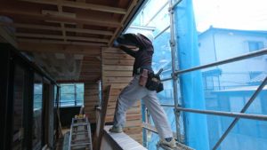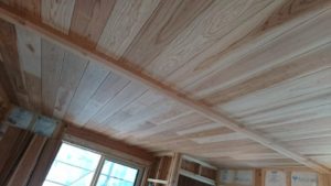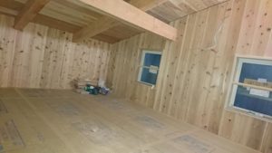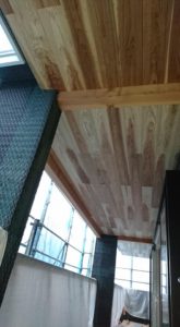 広島工務店 2階壁ボード貼り及壁天井杉板張り、2階ベランダ笠木取付け状況です by専務