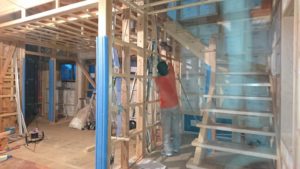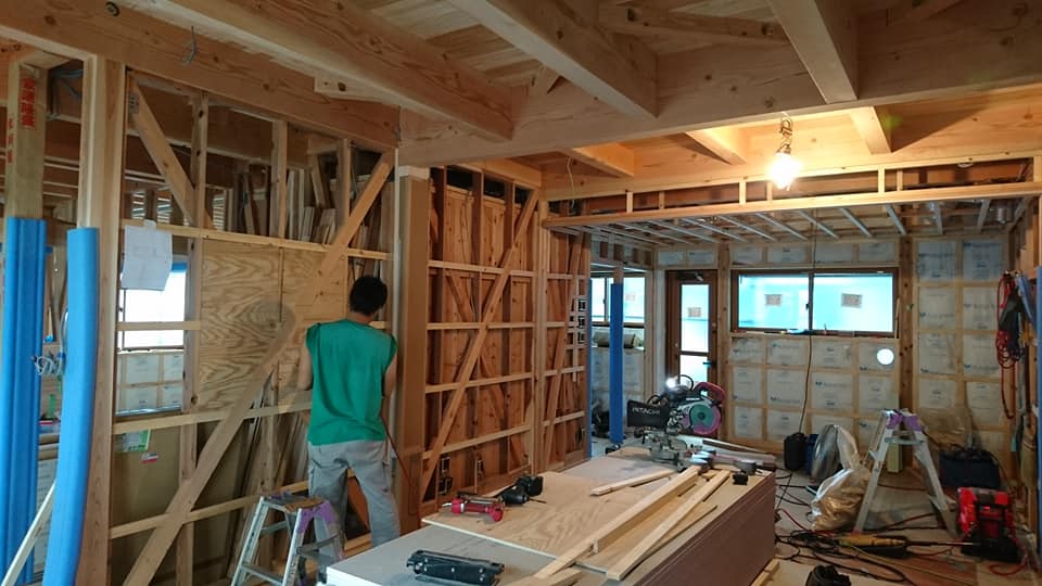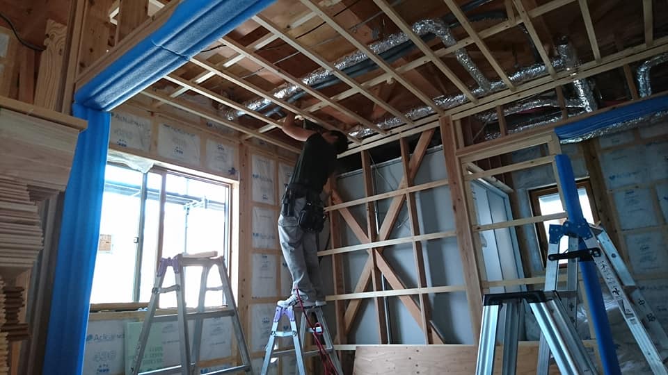 広島工務店 1階壁下地組、2階階段下下地組、ロフト床遮音ボード貼り by専務