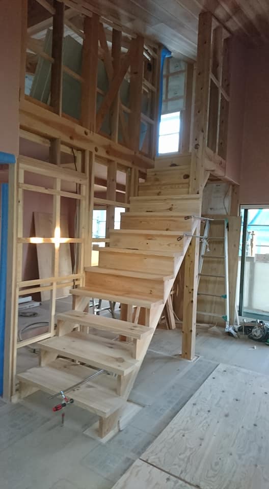 1階から2階への階段はオープン階段になってます。大工さんの匠の技の見せ所です。