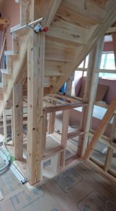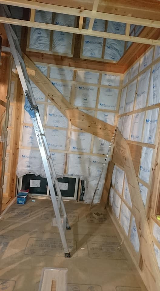 8月30日(木)1階壁下地組、2階階段下下地組、ロフト床遮音ボード貼り状況です