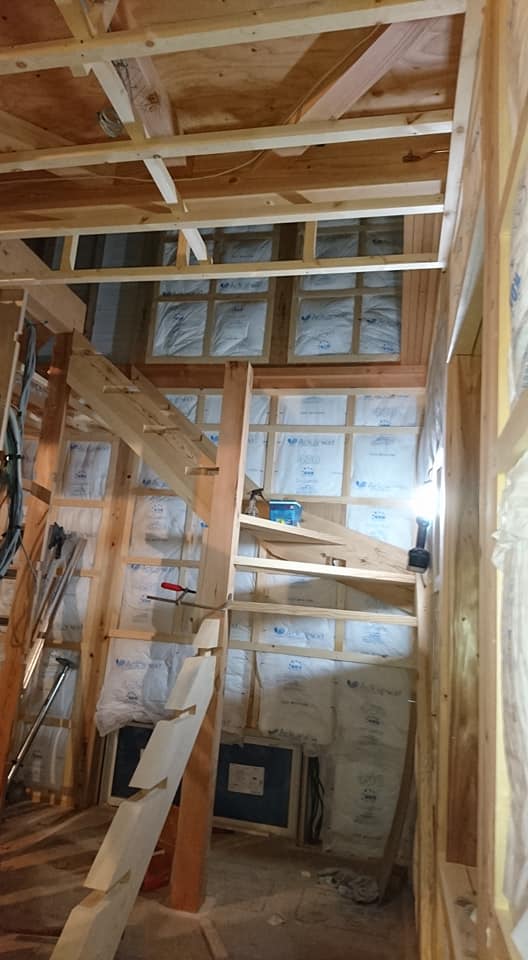 8月29日(水)1階天井下地組、2階→ロフト階段取付け状況です。