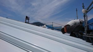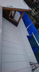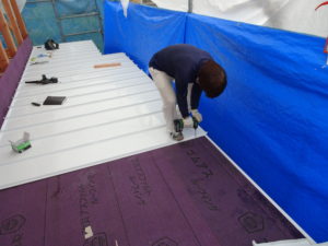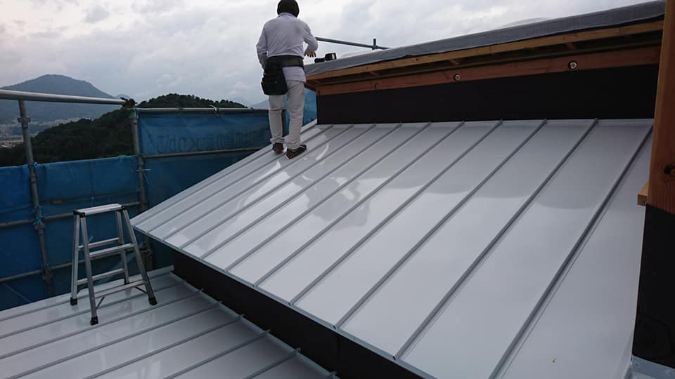 広島工務店 屋根材料荷揚げ・ガルバニゥム鋼板屋根葺き及木工事金物取付け by専務