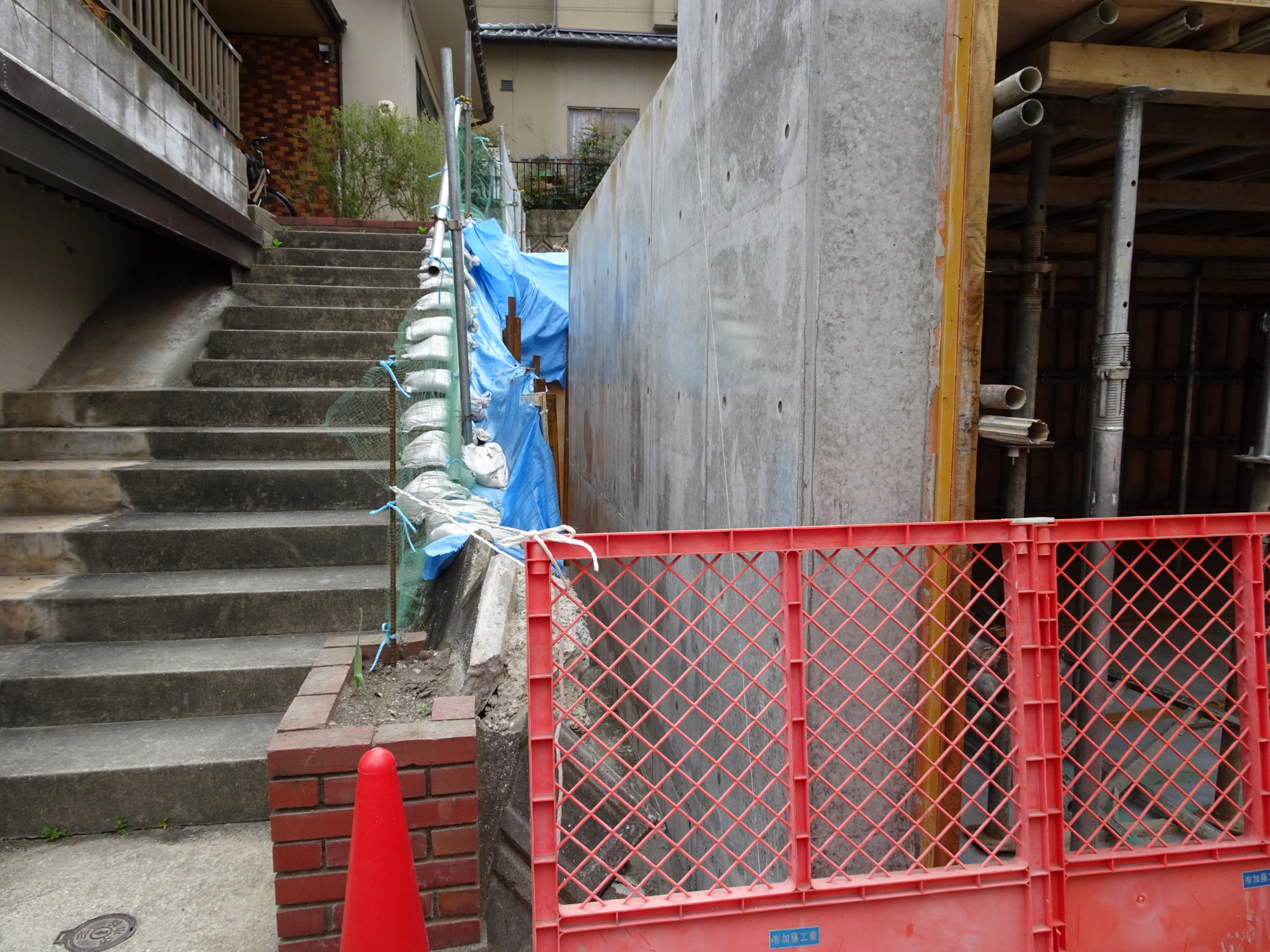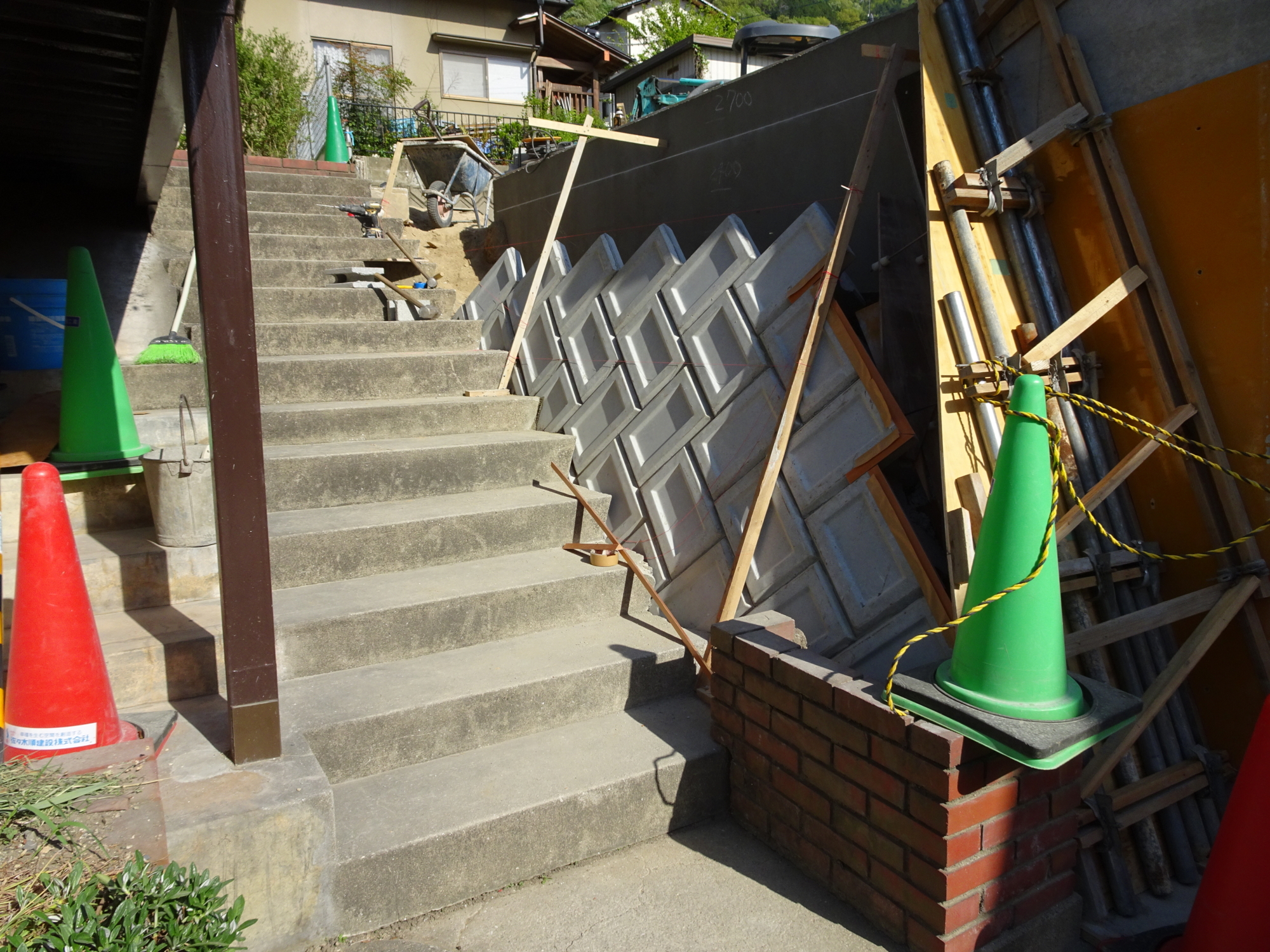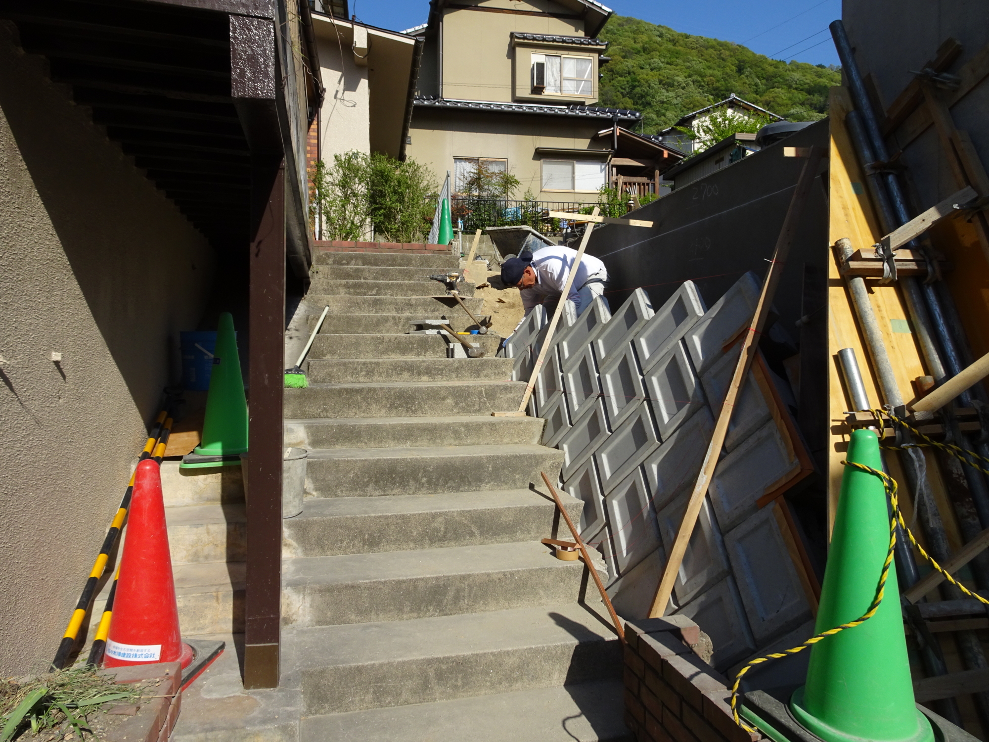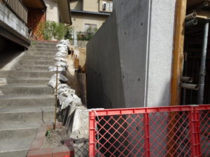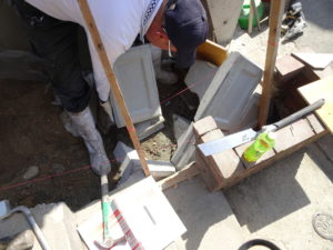 左側擁壁の間知ブロックは既存製品と現在の製品の大きさが違うため既存撤去して