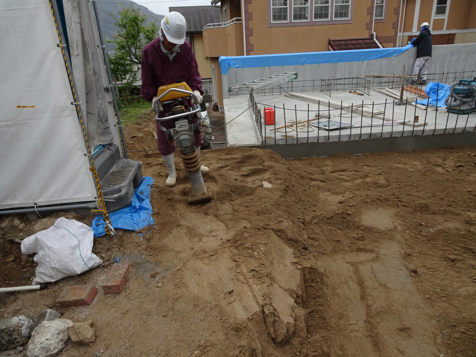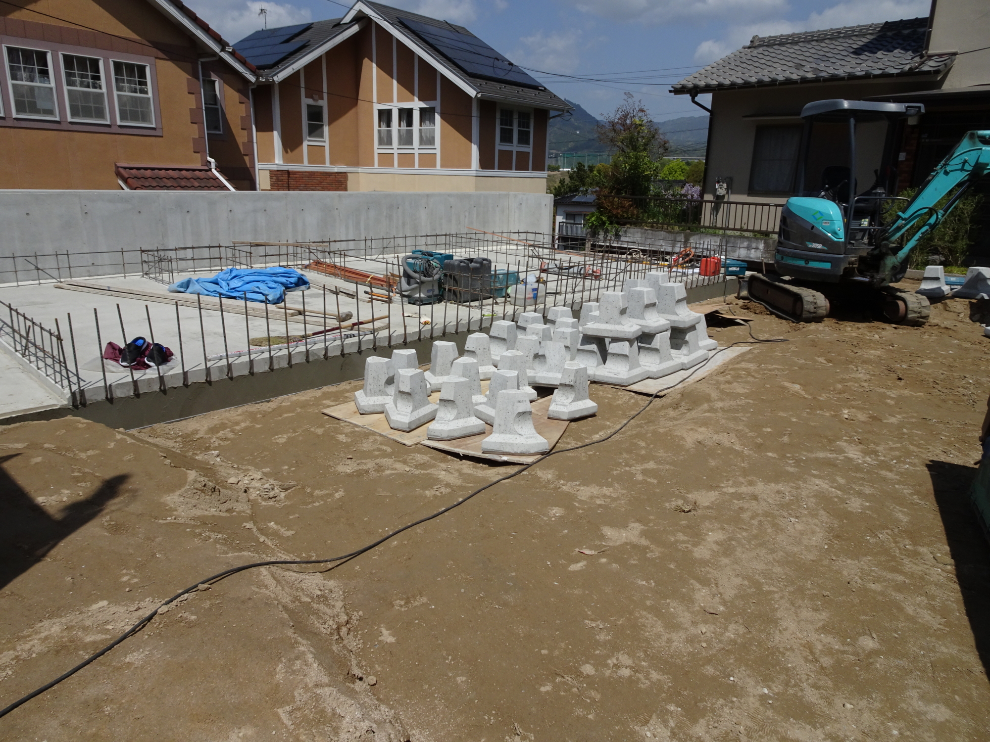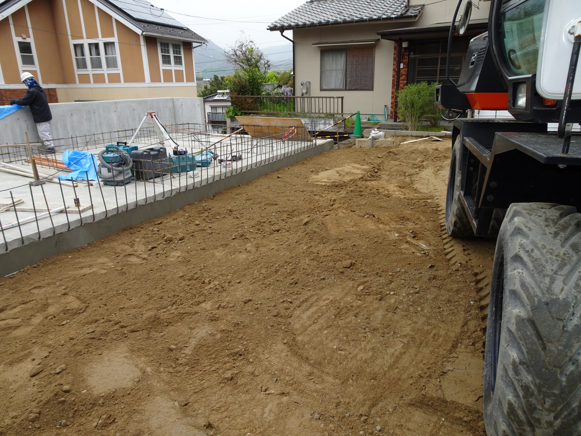 擁壁廻りの埋戻しも並行して施工しました。連休明けから木造基礎に取り掛かる予定です。