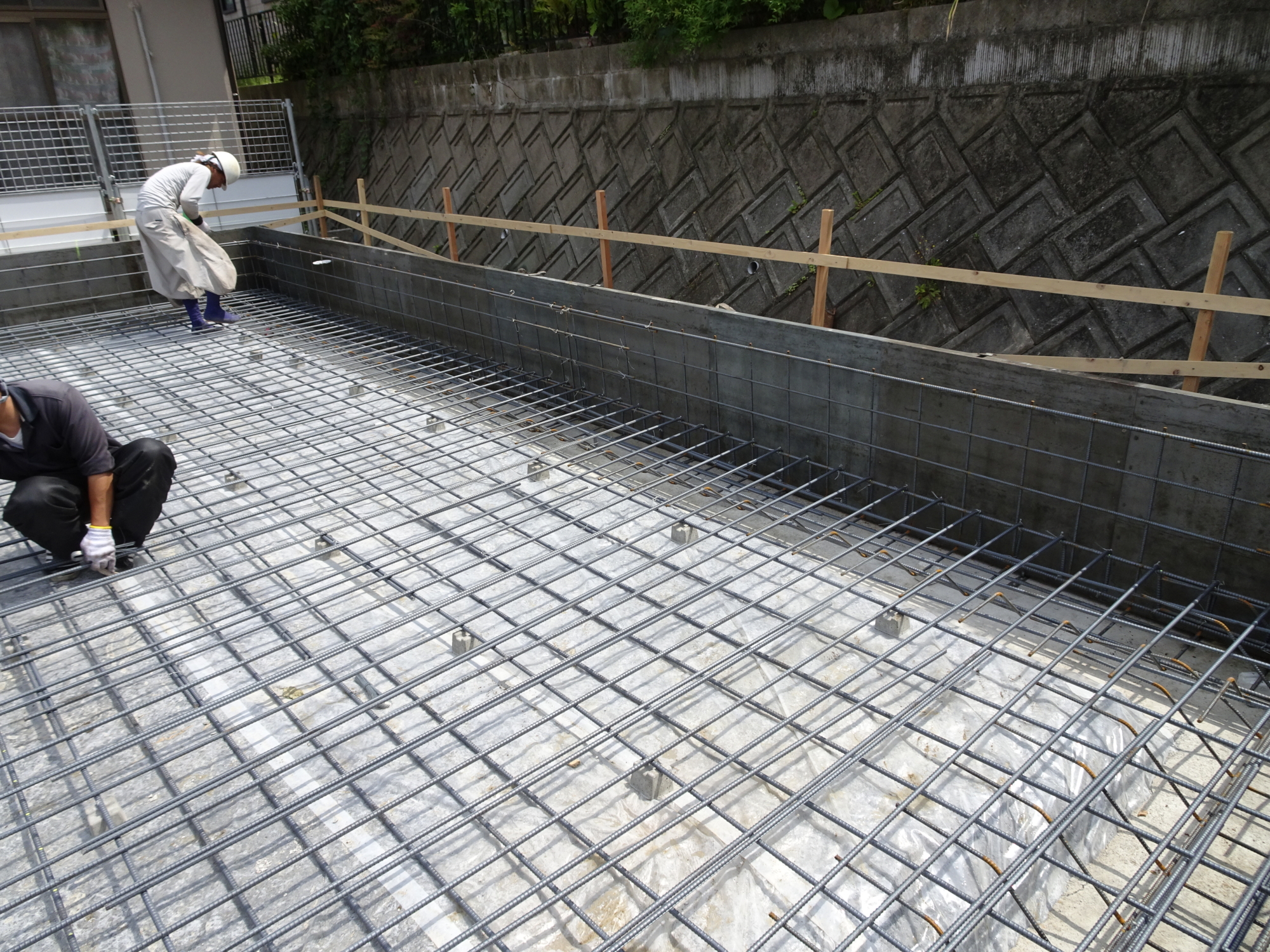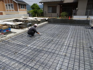 5月12日(土)木造基礎底盤スラブの鉄筋組です。掘り込み車庫と木造住宅の混種構造に