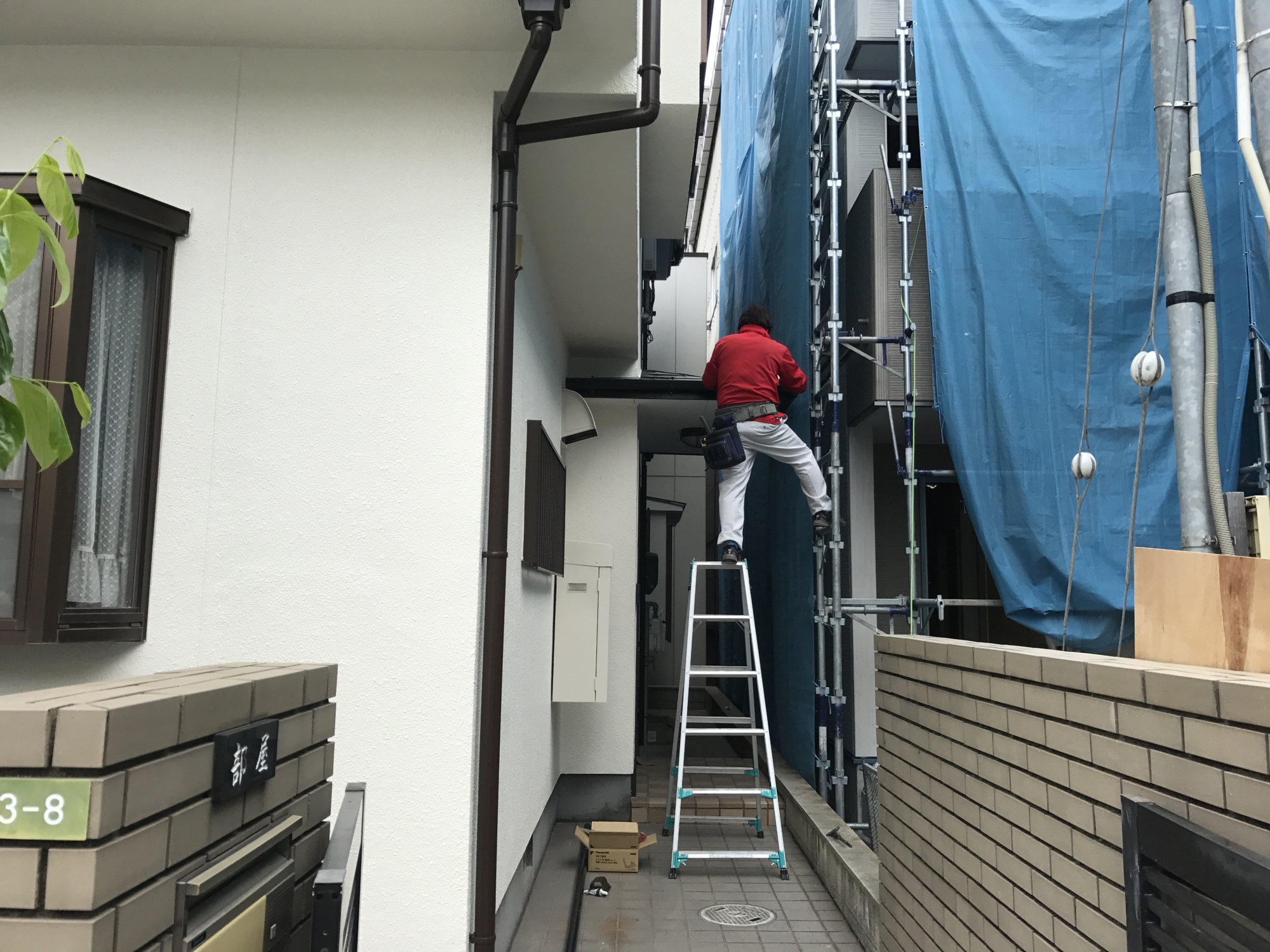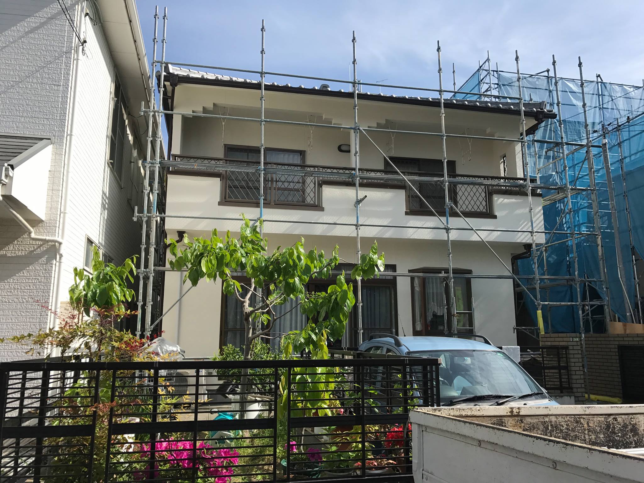 こんにちは。立花です。 2週間ほど前から宇品で、内外部のリフォーム工事をさせてもらいました。 外部では、外壁塗装や樋のやり替えをしました。 内部では左官さんに和室の壁を塗ってもらいました。 昨日で足場をバラしてもらい、今日で工事が終わりました。
