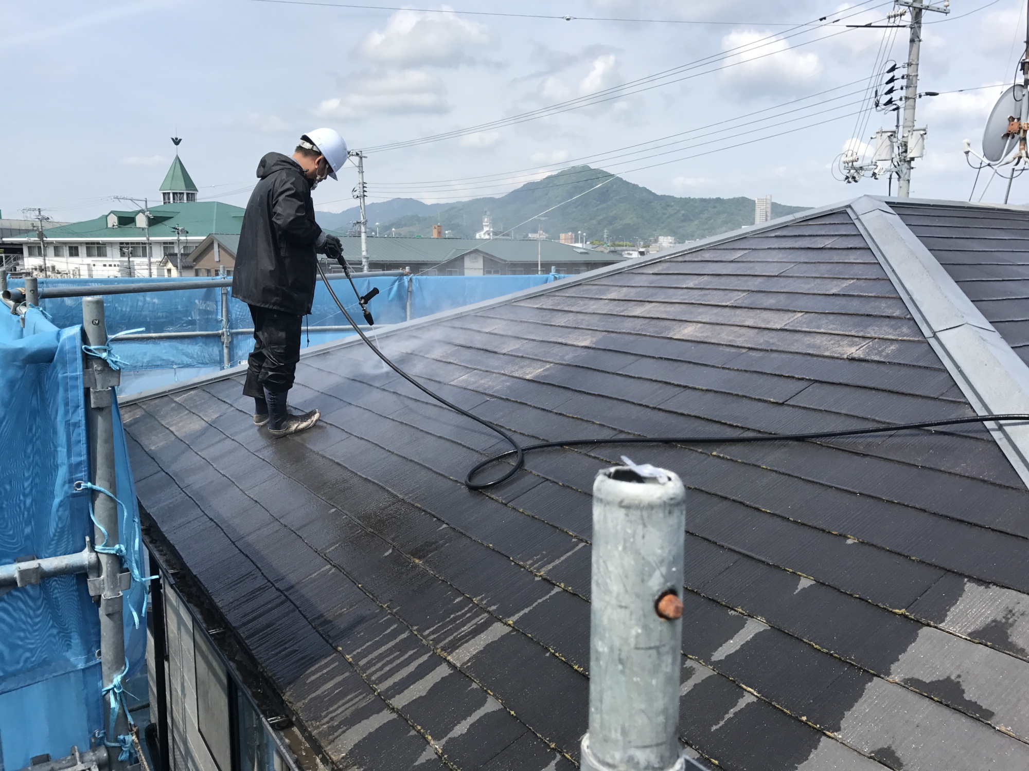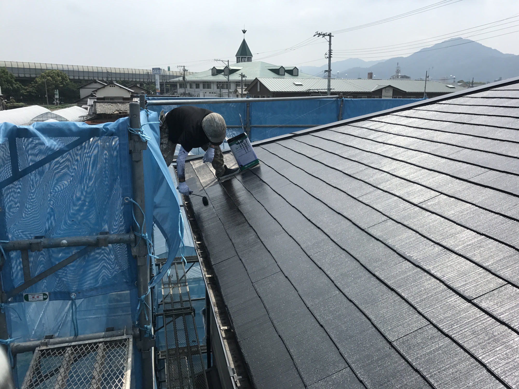 塗装工事も月曜から始まり、屋根の塗装をしてもらいました。