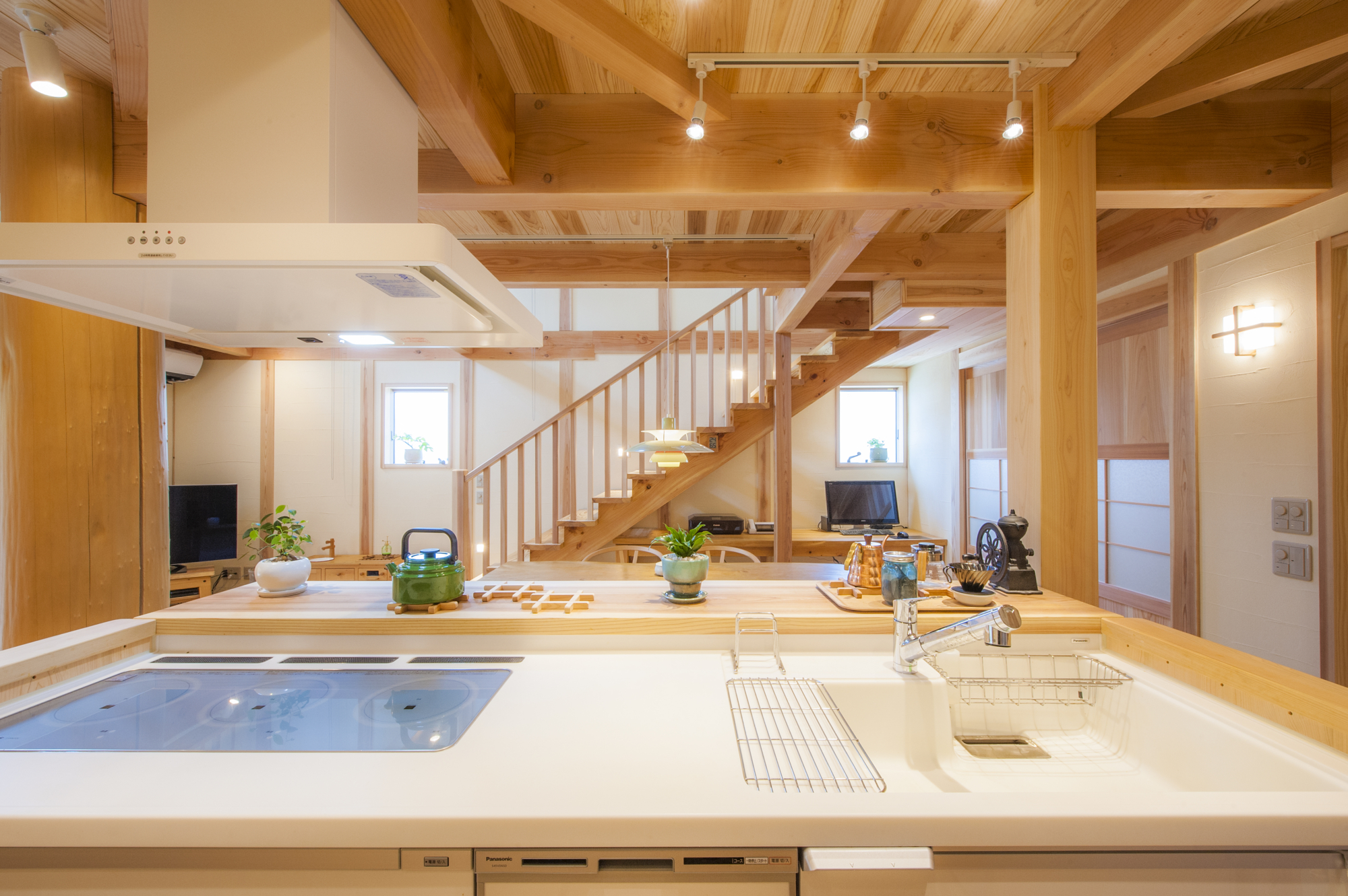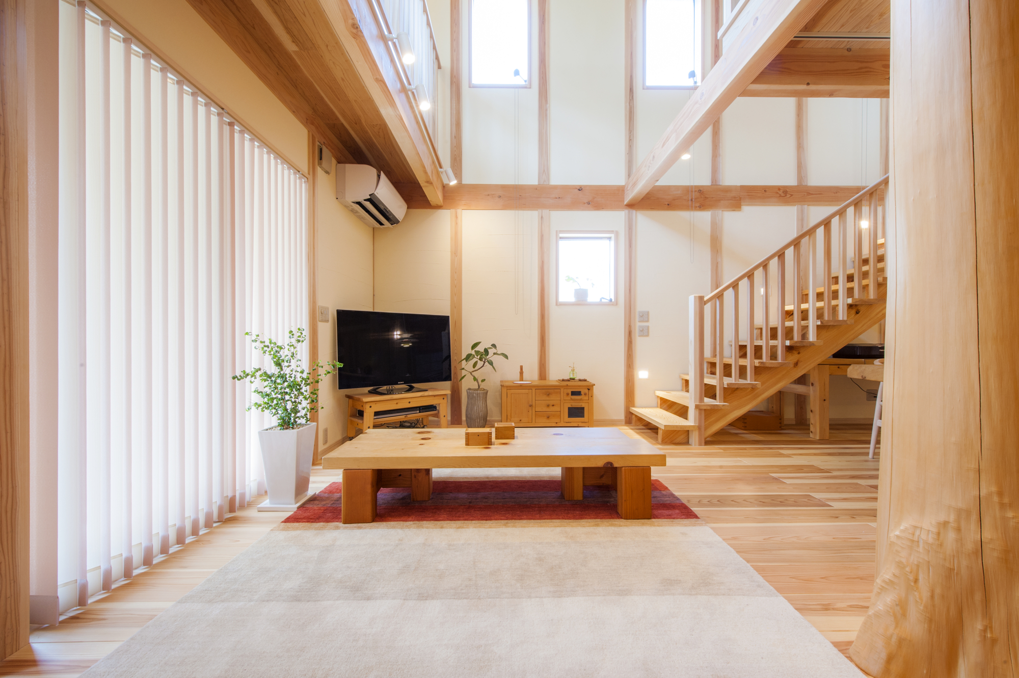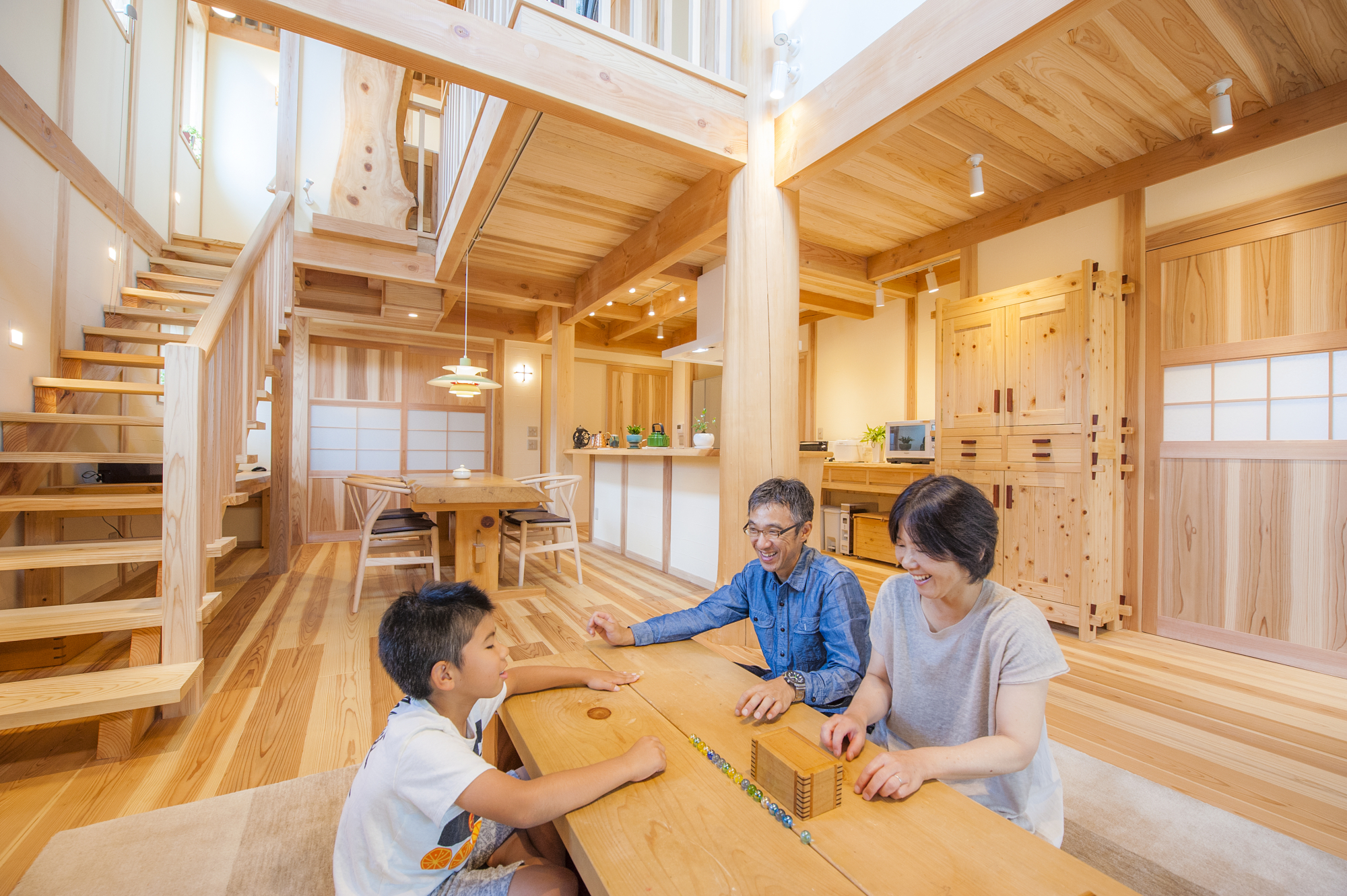 > 伝統工法の登り梁工法で大きな広がり空間を実現させた 無垢の木にこだわった家 広島 安芸区船越 M様邸